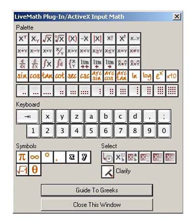 Nappi "Guide To Greeks" avaa uuden ikkunan, josta löytyvät ohjeet kreikkalaisten kirjainten ja paksunnettujen kirjainten näppäilemiseksi.
